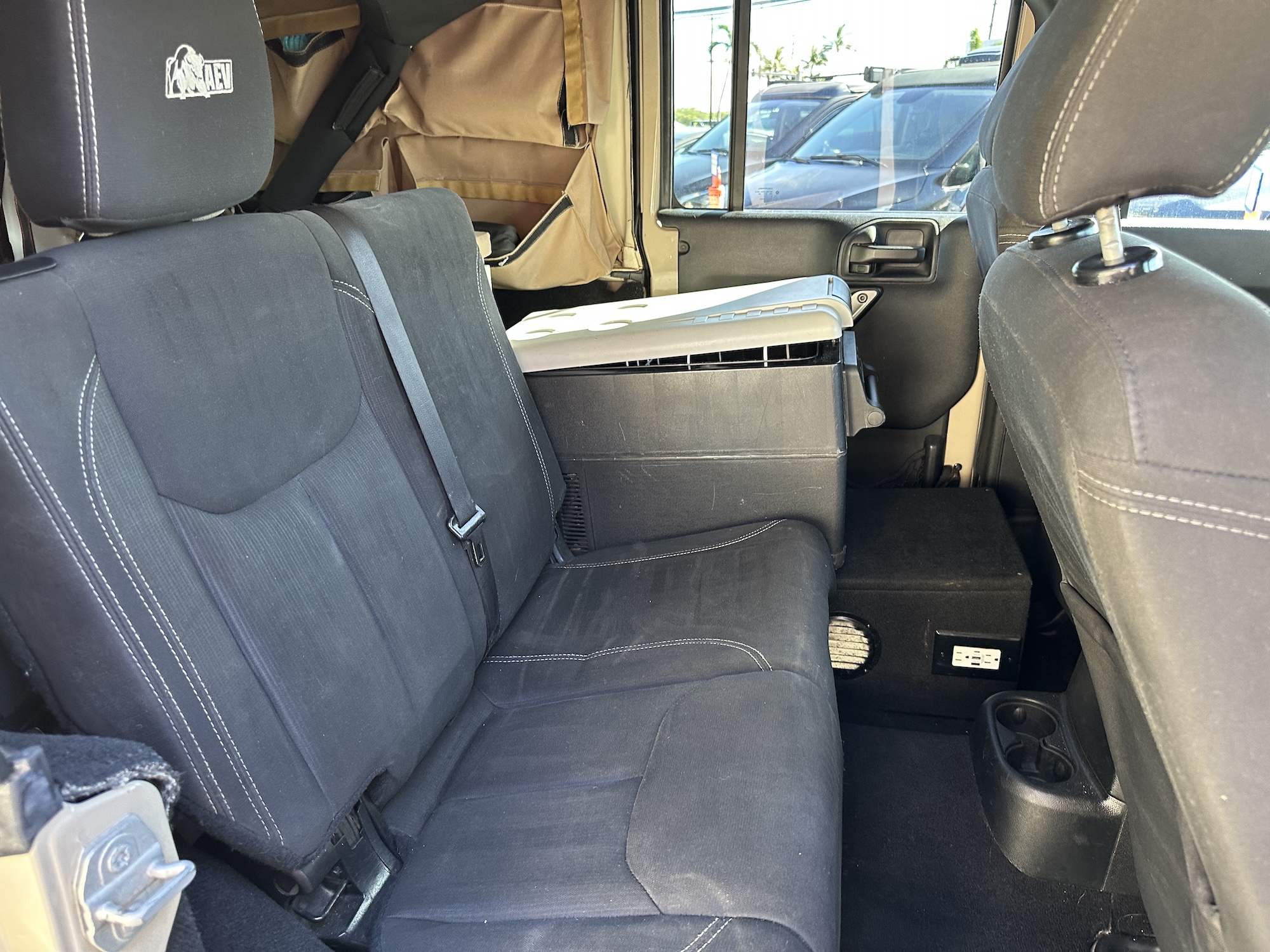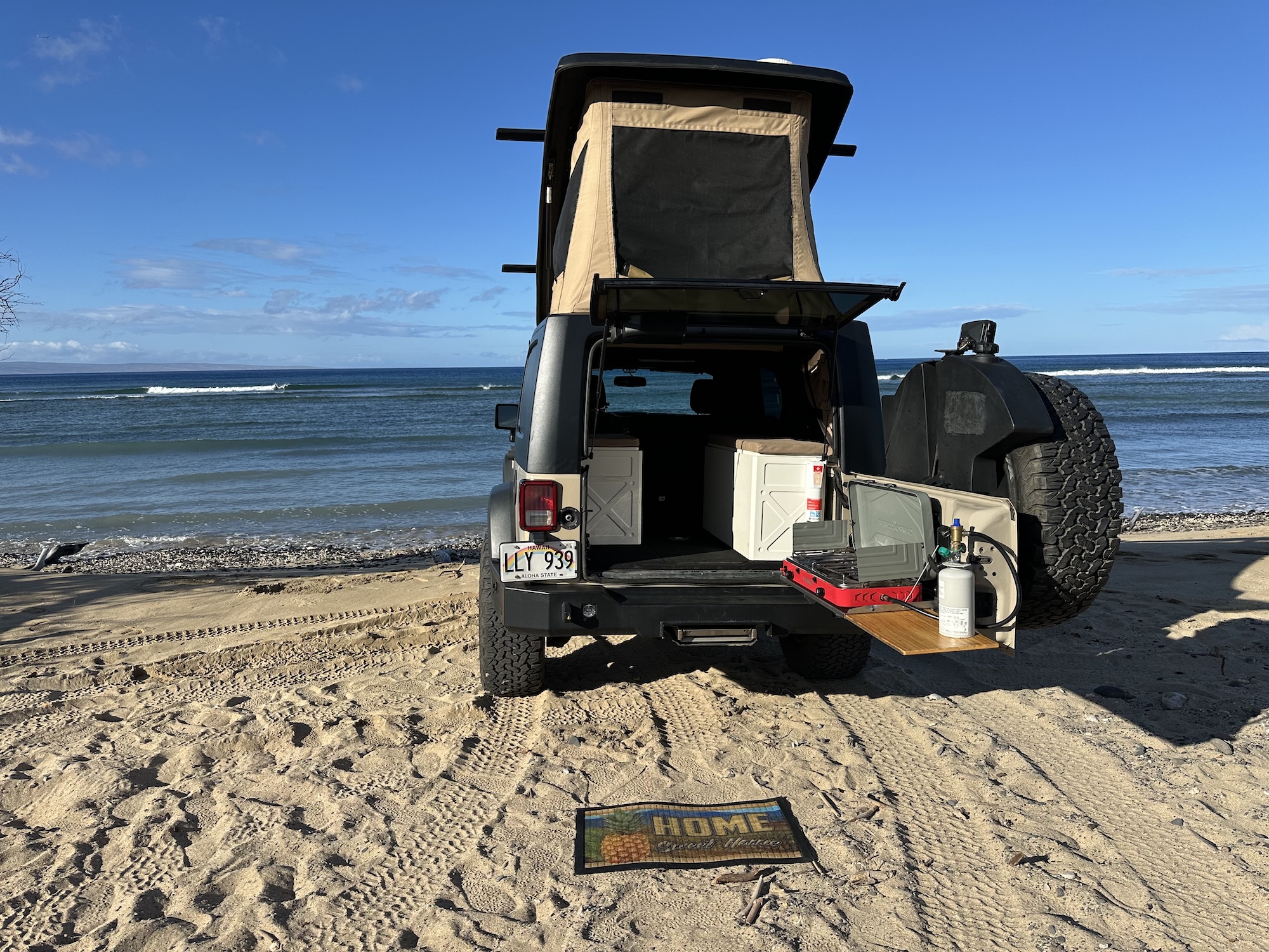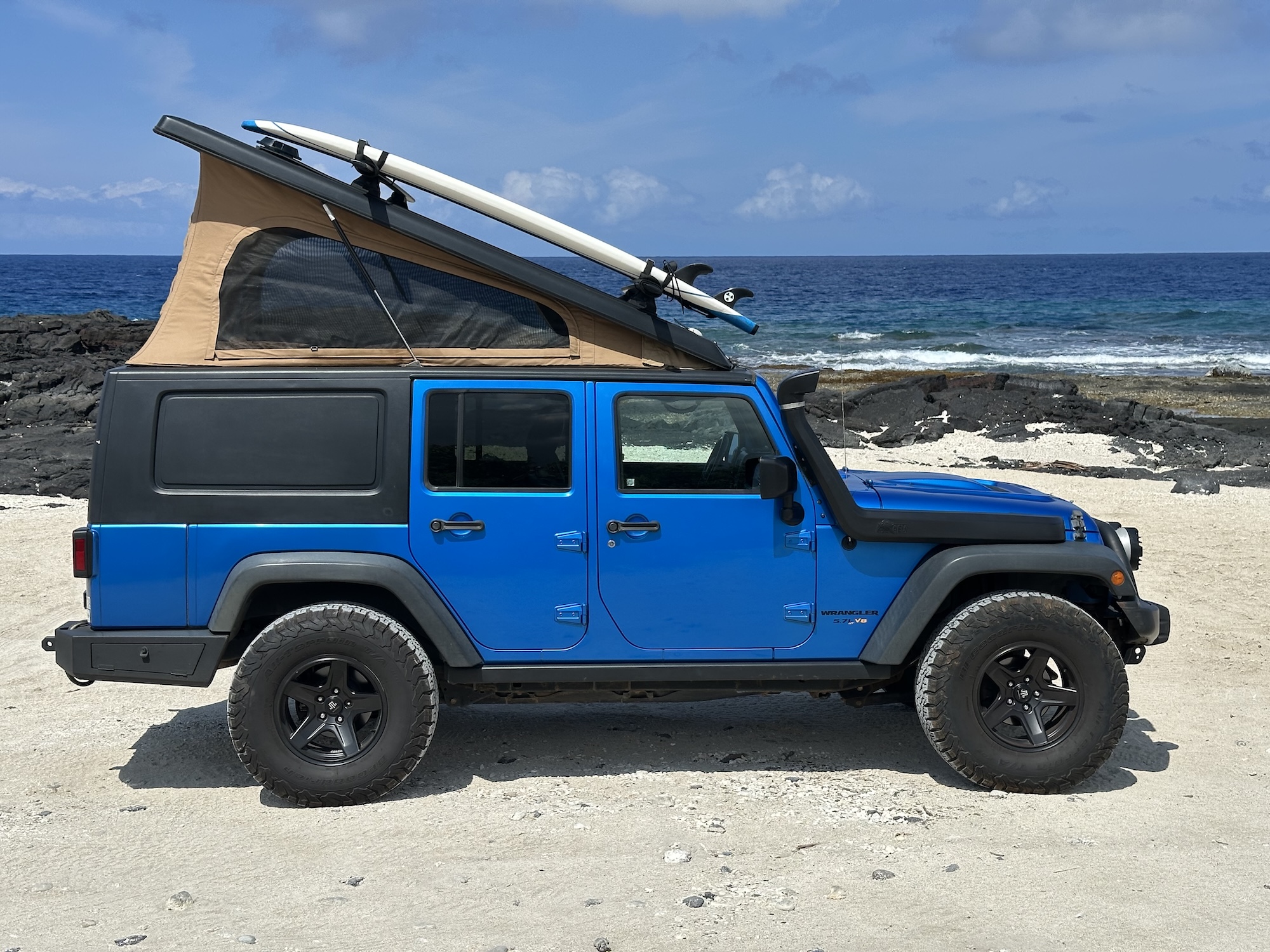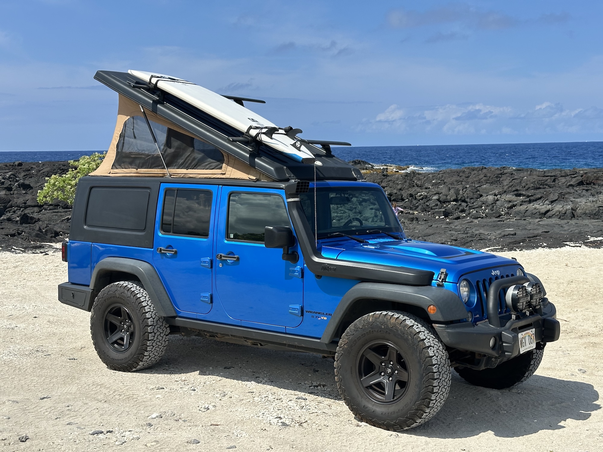 You are looking at the most capable 4WD pop-top camper-jeep on the Big Island. We took top of the line Jeep Rubicons with factory AEV-350 conversion, extended the rear 15", installed a new hardtop with integrated pop-top bed which is accessed from inside the vehicle. Our conversion also includes an outdoor shower, rear benches, a kitchen table, kitchen sink, a camp stove, a 35qt refrigerator, 120V AC power, and all the camping gear you need. It seats 4, but only sleeps 2 in the pop-top bed.