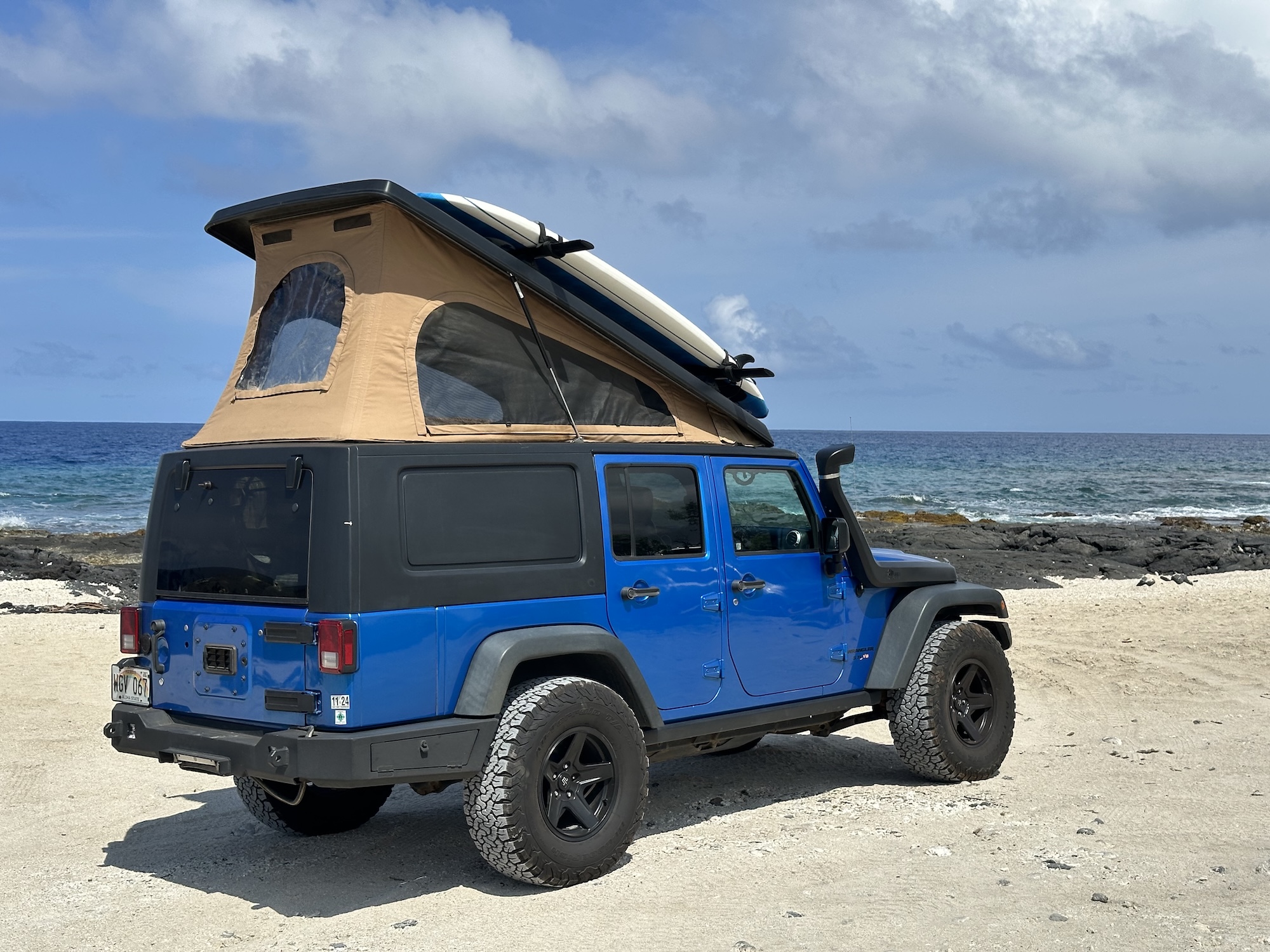 You are looking at the most capable 4WD pop-top camper-jeep on the Big Island. We took top of the line Jeep Rubicons with factory AEV-350 conversion, extended the rear 15", installed a new hardtop with integrated pop-top bed which is accessed from inside the vehicle. Our conversion also includes an outdoor shower, rear benches, a kitchen table, kitchen sink, a camp stove, a 35qt refrigerator, 120V AC power, and all the camping gear you need. It seats 4, but only sleeps 2 in the pop-top bed.